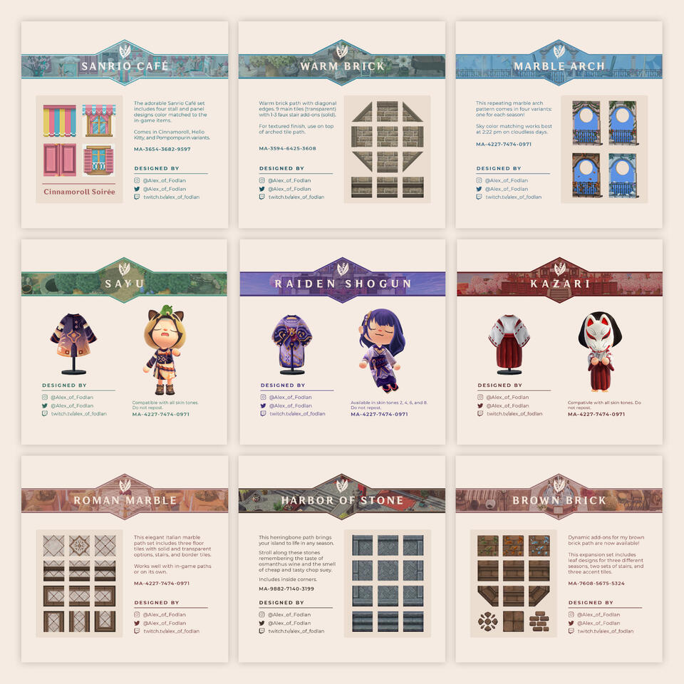 Since March 2020, I've been releasing custom paths, fabrics, and outfits for the Animal Crossing community. My journey as a pixel artist started with handmade cross-stitch patterns and was actually what got me into Animal Crossing!The first designs I ever released were paths to match the brick bridge. Since then, I've released over 500 works of pixel art across 6 different Creator IDs, including Genshin Impact cosplays, Italian marble tiles, and transparent balcony stickers.You can find my custom design showcases and the Creator ID for each design on my Instagram page either in my feed or my reels.I'm not currently accepting commissions, but, if you're looking for a recolor of any of my paths or outfits, you can reach out via my business email to discuss rates. If you like my designs and want to support me, you can buy me a KoFi!
